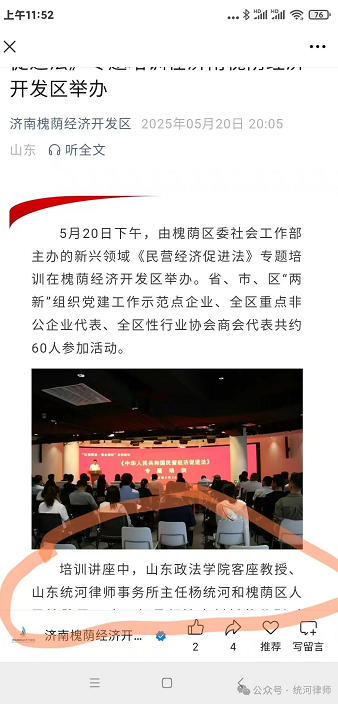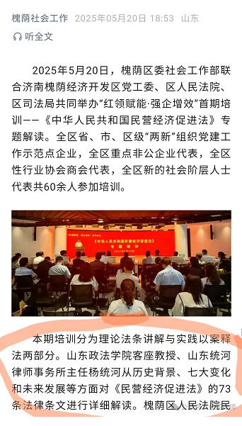 2025年5月20日,山东统河律师事务所主任杨统河受槐荫区委社会工作部邀请,在济南槐荫经济开发区举办“红领赋能·强企增效”首期培训——《中华人民共和国民营经济促进法》专题解读。