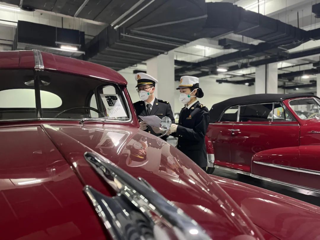 天津海关关员对古董车进行现场监管
