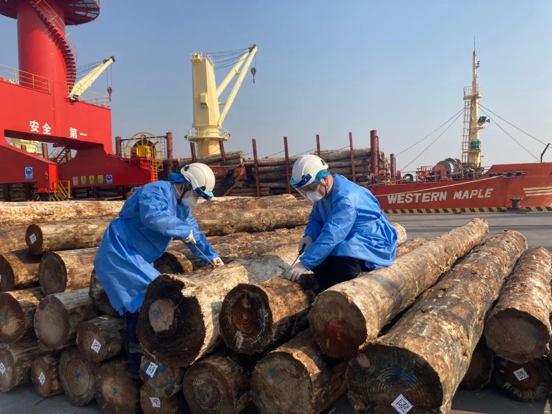 南京海关关员在港口进行木材船边查验,全力阻截外来有害生物