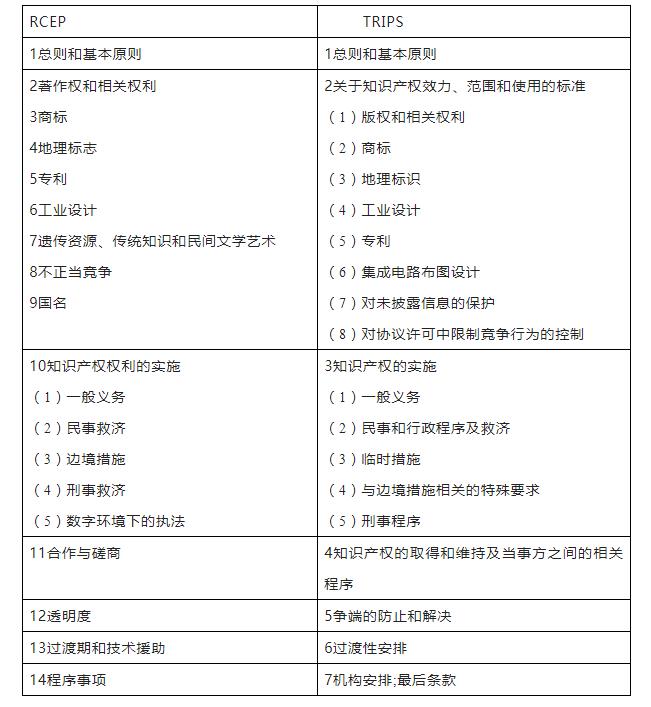 RCEP与TRIPS章节对比