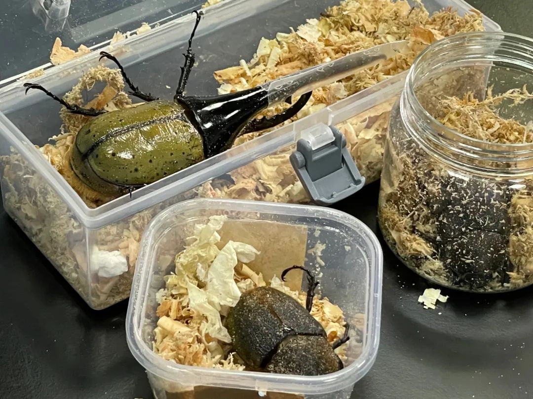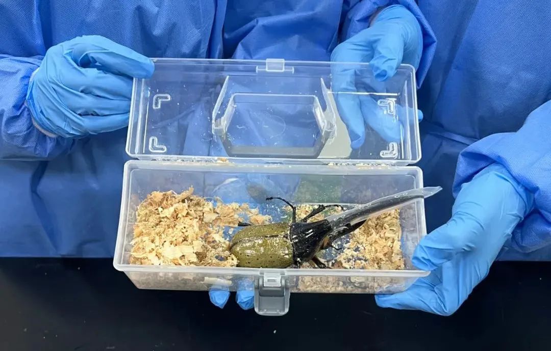 广州邮局海关关员在对一批进境邮件进行监管时,发现一个申报为“厨房用具”的邮件X光过机图像存在异常,与常见的厨房用具形态存在差异。关员立即对该邮件进行开拆,发现邮件里装着3个大小不一的透明塑料盒,盒盖上分布有用于透气的小孔,盒内填充木屑,每个盒内均装有1只甲虫。3只活体甲虫呈褐色,身体反射出金属光泽,十分有活力。其中最大的一只甲虫长约20厘米,头部有近10厘米的长角。经鉴定,3只活体甲虫均为长戟犀金龟,一只为雄性、两只为雌性。