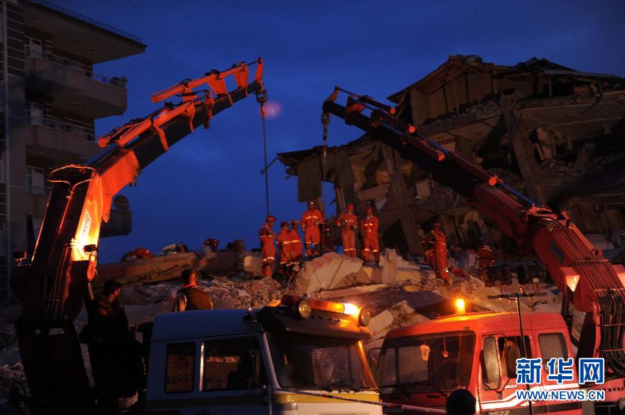 10月24日,在土耳其东部凡省埃尔吉斯,救援人员在废墟中寻找生命迹象。