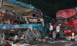 据青银高速公路淄博交警大队大队长王纪国介绍,7日11时44分许,济南市商河县长途汽车运输公司所属的鲁A96925号牌大客车自东向西沿青银高速行驶,至银川方向228KM+530M处时,与一辆轿车发生刮擦后,从银川方向穿越中央活动护栏,驶入对向车道,与济南旅顺旅游汽车有限公司驾驶人周玉山驾驶的鲁A18526号牌大客车发生碰撞,致使后者翻入高速公路边沟。事故造成6人当场死亡,8人抢救无效死亡,目前还有6名重伤和轻伤人员正在接受治疗。