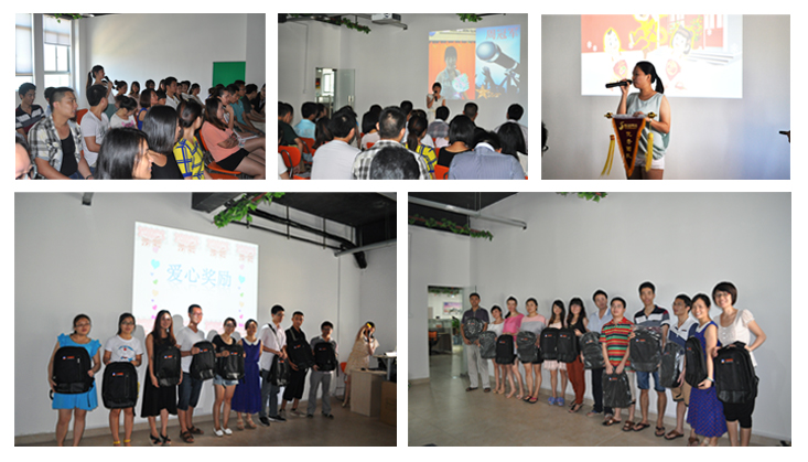 在大家进行了交流学习之后,进入到本次会议的“爱心奖励”环节。为感谢大家一个月的努力,宋副总经理,郑副总经理为每人颁发书包一个,以资鼓励。书包是用来装书的工具,也是希望大家每人心中都装着工作,装着知识,以更加勤奋好学的心态努力!大家接过书包,众人合影留念。