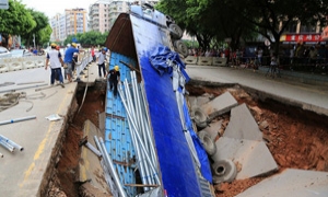 广西梧州一街道坍陷现天坑