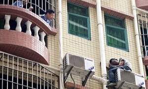 据吉林市中兴街上一所高中学校学生反映,吉林市田家炳高级中学为让学生中午在食堂用餐故意将原有的一小时午休时间缩短为半小时,并禁止学生将午饭打包带回学校食用,逼不得已学生们只能顶着大风坐在路边“享用”午餐。图为2015年4月1日,在吉林省吉林市中兴街吉林市田家炳高级中学门前,一些学生围在马路边上吃午餐。