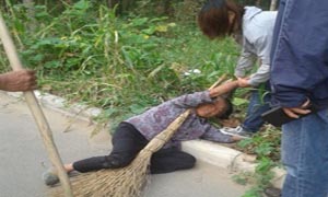 网传视频显示,一名黄色长发、身材瘦弱的女子躺在绿化带内,两眼浮肿眯成一条线,嘴部肿胀,满嘴是血;女子情绪有些激动,似乎不愿接受路人帮助。